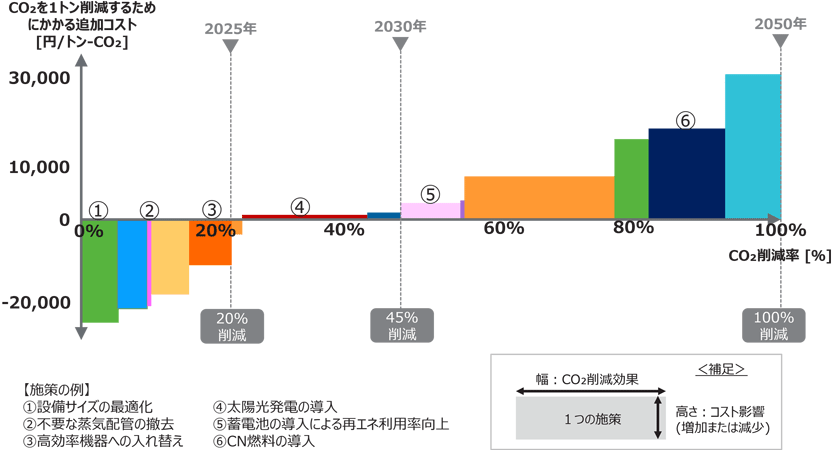 「排出削減ロードマップ策定支援」では、まずはお客さまからエネルギー使用量やエネルギーフロー、 主要設備などのデータを提供いただき、お客さまの事業や生産プロセスのどこでどのくらいのCO2が排出されているのかを確認します。 その後、お客さまの現場に足を運び、実際の設備の稼働状況や生産プロセスなどのウォークスルー調査や、 現場の従業者へのヒアリングを通してCNに資する施策を洗い出してCO2削減効果とコストを評価分析します。 これらの施策に対して、どういった優先順位をもってCO2を 削減するのか、それらにどれくらいの効果があるのかをCNカーブで、 視覚的に分かりやすく提案します。これらの活動には、1~2ヶ月のお時間をいただいております。 お客さまには、改めてこのCNカーブを社内で検討していただき、具体的な活動へと進んでいただきます。