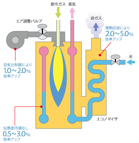 都市ガスは、燃焼効率が高く負荷に応じた高効率な運転により、従来の油ボイラに比べて省エネルギー性に優れています。また、ススによるボイラ効率の低下もありません。さらに都市ガスは、低温腐食の原因となる硫黄をほとんど含まないため、エコノマイザでの十分な排熱回収が可能です。