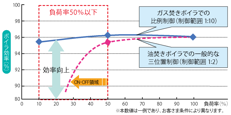 都市ガスは、広い燃焼制御範囲(高ターン)を実現でき、負荷率の低い領域での効率が向上します。