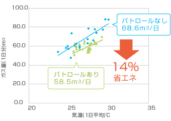 省エネ効果はお客さまの使用状況や管理状況によって異なりますが、パトロール機能の利用により、10~20%の省エネ効果が期待できます。