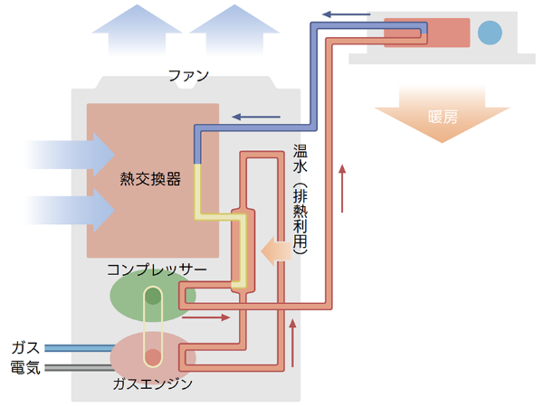 GHP(ガスヒーポン)は室外機のコンプレッサーをガスエンジンで駆動し、ヒートポンプ運転によって冷暖房を行う空調システムです。