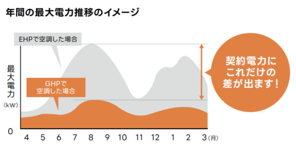 ガスを熱源とするGHPの消費電力は電気式ヒートポンプ(EHP)に比べて圧倒的に消費電力が少ないため、真夏など電力ひっ迫時のピークカットに貢献します。