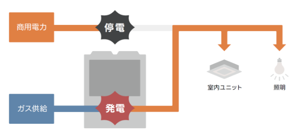 大雨や台風による万が一の停電の際に、ガス供給のみでエンジンを起動。空調を継続するだけでなく、余剰電力を照明などにも利用でき、安心と信頼を提供します。