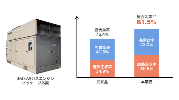 450kW高効率ガスエンジンは、380kWガスエンジン(以下、「従来品」)をベースに開発した製品※1で、燃焼の最適化や高効率部品の採用等により、出力400kW級ガスコージェネで世界最高クラスの発電効率42.0%、総合効率81.5%※2を実現しました。