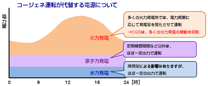 CO2削減効果の評価において、コージェネレーションシステムによる発電電力は火力発電所における発電電力を削減するものとして、火力発電所の排出原単位を用いることが妥当であると考えられます。