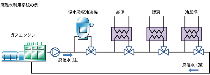 温水吸収冷温水器は廃温水温度が低下すると運転出力が低下するため、まず最初に温水吸収冷温水器へ廃温水を送ります。次に、給湯と暖房では給湯の方が必要温度が高いため、給湯、暖房の順に廃温水を送ります。廃温水利用系統の最後は、冷却塔により廃温水の余剰熱を放熱し、基準温度以下にしてガスエンジンに戻します。これはガスエンジンの冷却不足などによる故障を防止するためです。