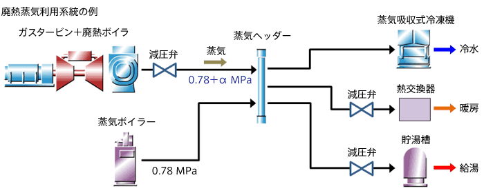 排熱を蒸気で回収する場合は、蒸気ボイラからの蒸気と共通の蒸気ヘッダーに接続し、蒸気吸収冷凍機、暖房、給湯などに利用します。コージェネレーションシステムから出る排熱蒸気を有効に利用するために、蒸気ボイラの設定圧力よりも排熱蒸気の圧力を少し高く設定します。これにより蒸気需要が低い時は、蒸気ボイラーが停止し、コージェネレーションシステムから出る排熱蒸気を優先的に利用することができるようになります。
