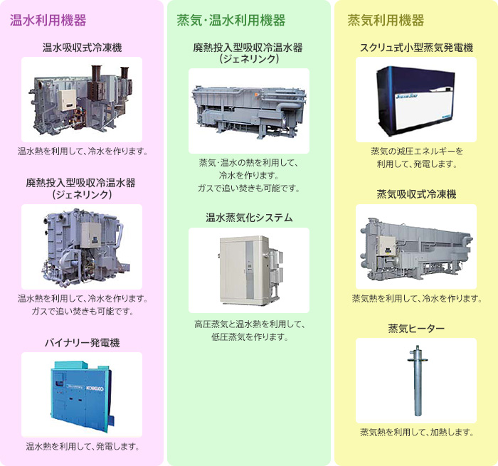 近年は現場のニーズに合わせた、様々な排熱利用機器が登場しています。余剰排熱を減らし、排熱の利用率をさらに向上させることが可能です。