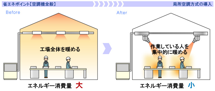 工場等で人の活動スペースに絞って空調することで、快適な体感温度を維持しながら、エネルギーの無駄を省くことができます。