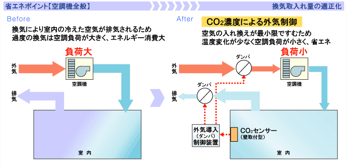 一般的に建物のCO2濃度は規制値※より1~3割程度低い傾向にあります。そこで換気量を制御することで空調負荷を低減することが可能です。