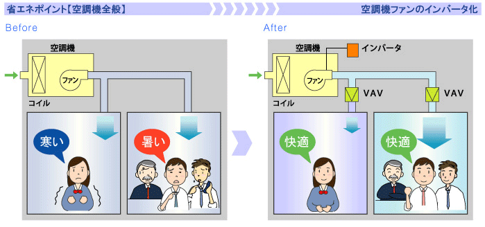 ファンにインバータを取り付け、適切な風量にすることで、消費電力の削減ができます。また、可変風量化(VAV)することで、空調負荷に応じた風量にすることができ、快適な温度を保つことができます。