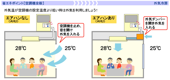 外気温度が設定温度より低い時、冷房を停止し外気を導入することで、エネルギー消費量を削減できます。