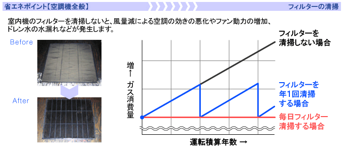 フィルターを定期的に清掃することで、空調の効きの悪化やファン動力の増加を防ぎ、エネルギー消費量の増加を防ぐことが可能です。
